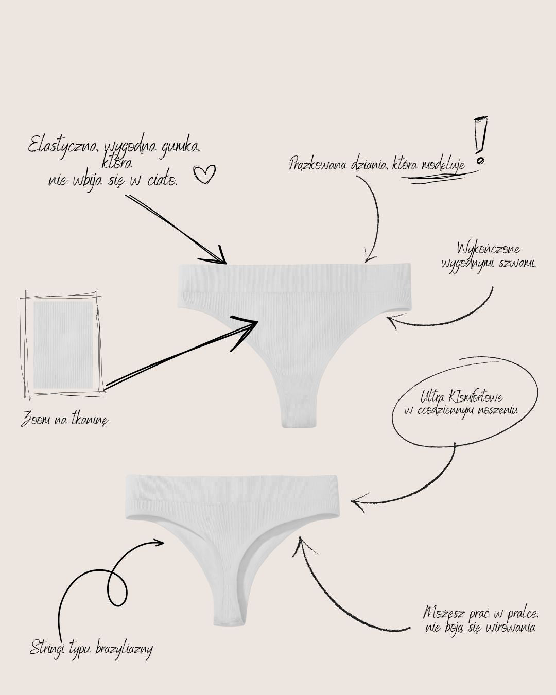 Ultraleichte, dehnbare Tangas im minimalistischen Design aus weichem Rippstrick, der sich perfekt an den Körper anschmiegt. Dank ihrer nahtlosen Verarbeitung sind sie unter engen Kleidern, Hosen und Röcken unsichtbar und garantieren so absolute Diskretion und höchsten Tragekomfort den ganzen Tag.