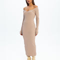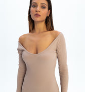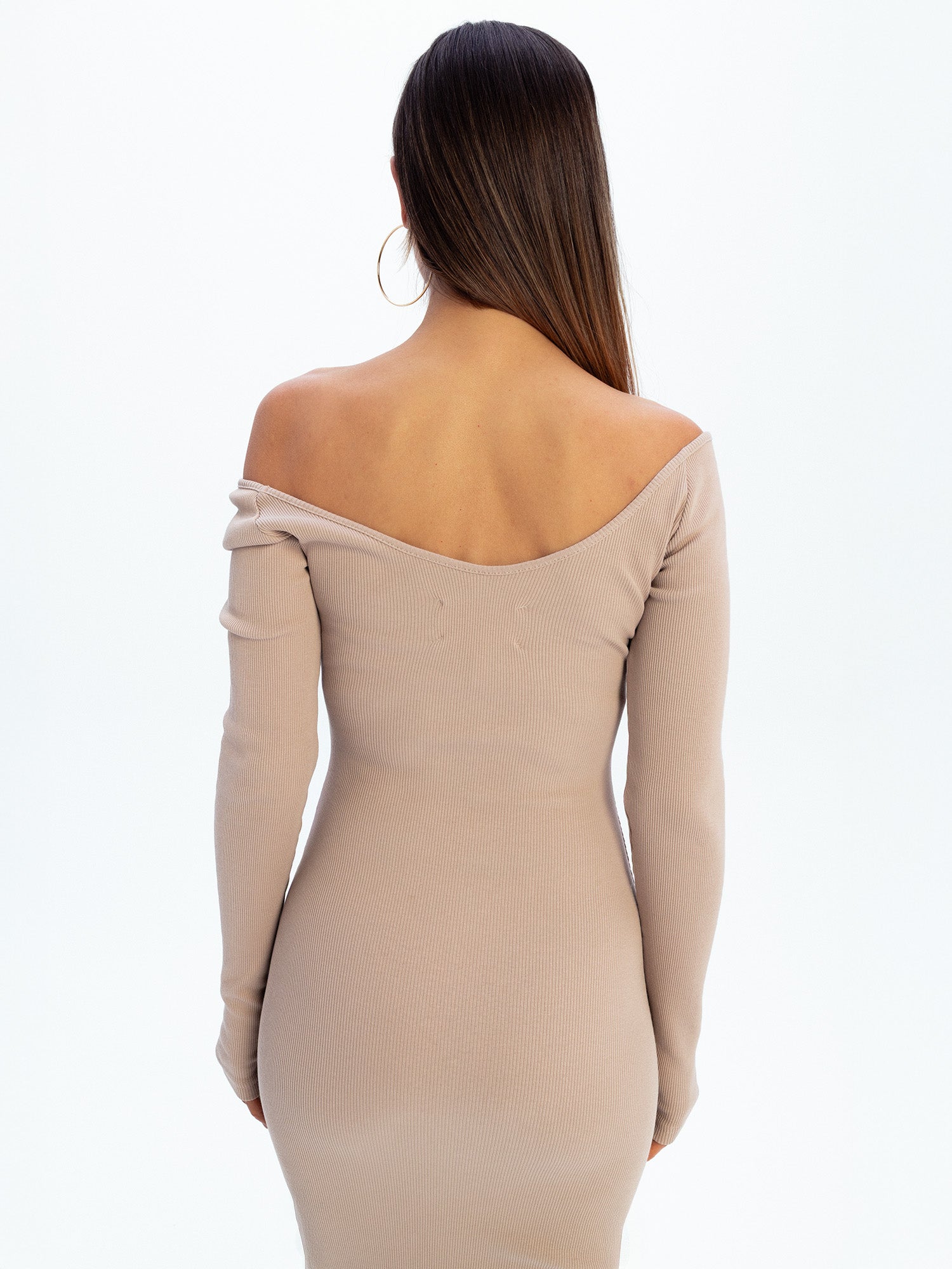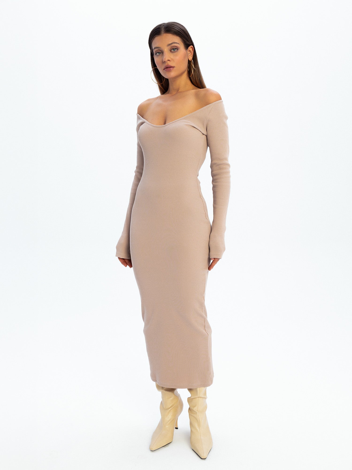 Kobieca sukienka wykonana z elastycznej, prążkowanej dzianiny, która idealnie dopasowuje się do sylwetki. Model z dekoltem, który można nosić na dwa sposoby – klasycznie na ramionach lub z opuszczonymi ramionami, dla bardziej zmysłowego efektu. Długość maxi i dopasowany fason podkreślają figurę, zachowując jednocześnie minimalistyczną elegancję.